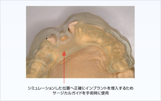 暫間義歯を装着しCT撮影・診断の後インプラント埋入位置を決定、その位置へ正確に埋入するため作製されたサージカルガイドを用いて手術を行います。