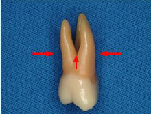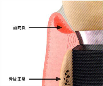 図に示した様に、前歯は歯根が1本であるのに対し奥歯の歯根は殆どが複数本でその形態も複雑です。正確なブラッシングも難しく、また歯周病(細菌感染)が一旦歯の周囲に拡大すると確実な細菌の除去が難しくなります。