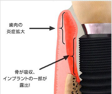 インプラント周囲の歯肉炎の拡大、骨も吸収。天然歯の歯周炎に相当。