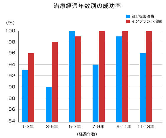 ご覧のように、歯の一部分を抜去し保存された歯の術後13年の成功率は平均95%、インプラント治療の平均は98%と、大きな違いは認められません。更に見てみると、インプラント治療の経過不良例が術後3年以内に集中(66%)しています。