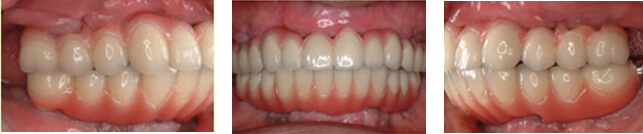 残念ながらここまで歯周病が広範囲かつ重度に進行してしまうと全て抜歯→総義歯が一般的な治療方針となりますが、患者様の強いご希望により必要最小限の本数を用いたインプラント治療によって、固定性補綴物による咀嚼回復が可能となりました。