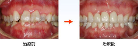 | 治療内容 | 全体的にホワイトニング後、上顎前歯にセラミック冠をかぶせ直し |